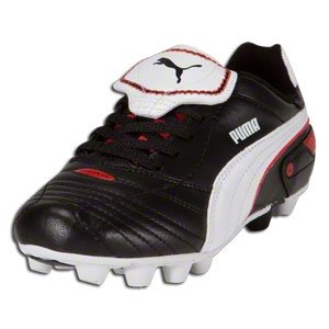 Puma Youth Esito Finale r HG Soccer Cleats... Great For Young Athletes! A classic style with added power and performance. The Youth Esito Finale r HG Soccer Cleats have a lightweight construction for maximum speed and an abrasion resistant upper for greater power behind every shot. Puma Youth Esito Finale r HG Soccer Cleats feature: Soft synthetic upper for lightweight comfort and durability Quilted vamp for great ball control Fold-over tongue with centered lace-up closure for secure fit Soft ankle lining for great comfort Molded rubber outsole for durability and support For use on hard and dry natural surfaces Colors: Black/White/Red Sizes: 1 - 61/2 (includes whole & 1/2 sizes) 11, 12, 13 Puma Soccer... Quality, Consistency & Cutting-Edge Style!